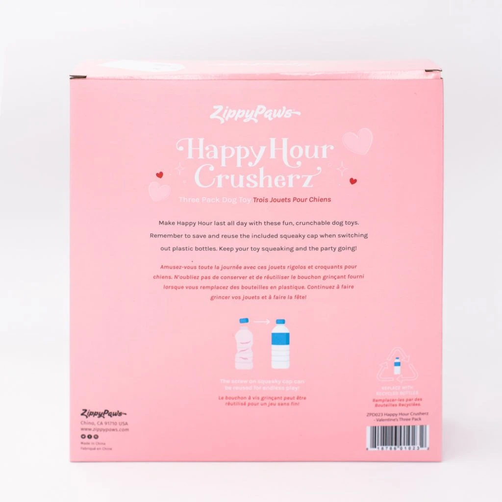 Set includes 3 V-Day Happy Hour Crusherz toys (Chardonnay, Merlot, and Rosé). Each Happy Hour Crusherz comes with a free water bottle and a reusable squeaky cap. Simply refill it with an empty water bottle and reuse the cap to keep your dog playing for hours. Reusable squeaky cap works with most water bottles (Arrowhead, Aquafina, Nestlé).