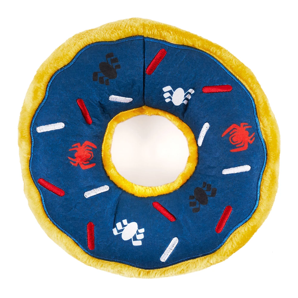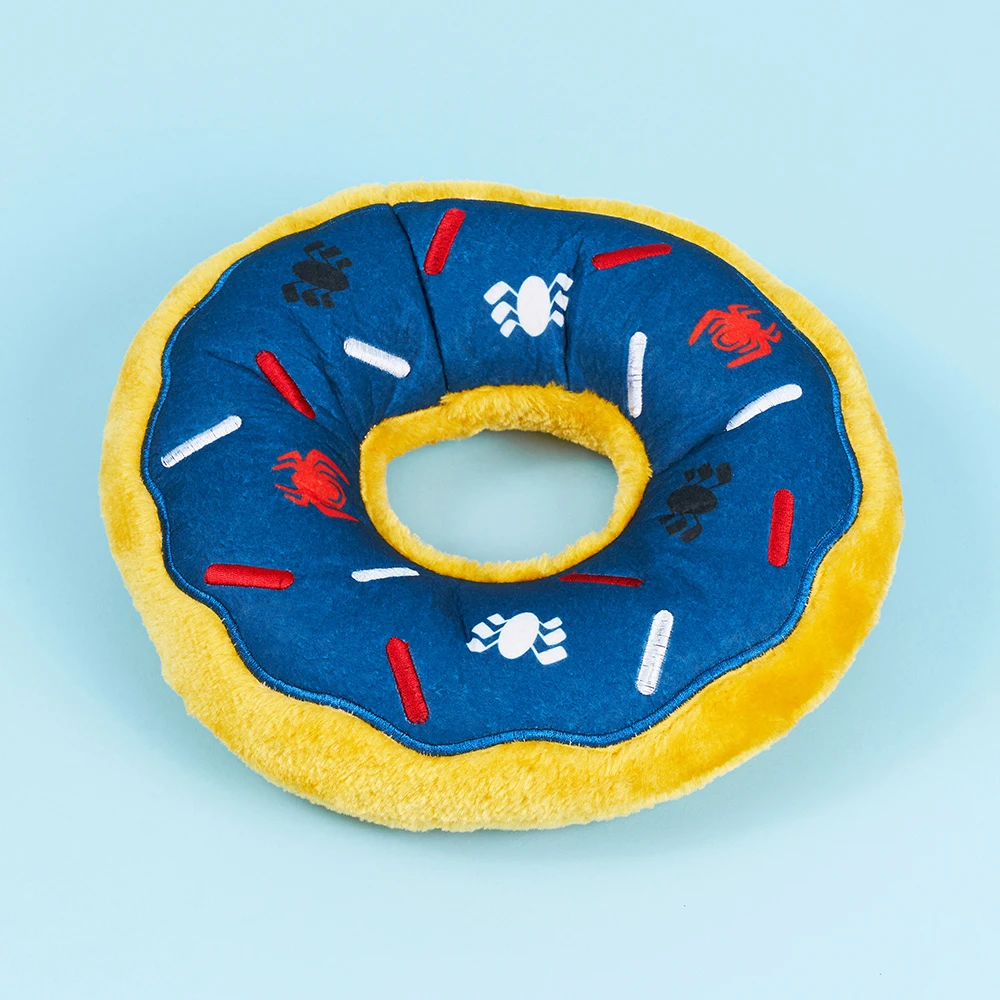 The Spider-Man Jumbo Donutz features embroidered sprinkles and printed icons representing Spider-Man, Miles Morales, and Ghost-Spider! Each Jumbo Donutz dog toy includes 2 large Blaster squeakers and is filled with super soft stuffing, making it a great pillow for napping as well!