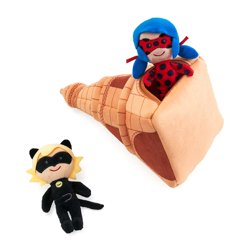 Miraculous Zippy Burrow® Heroes in Paris dog toy! Just stuff the adorable little Ladybug and Cat Noir Miniz into the Eiffel Tower and sit back and watch as your dog works to dig the little heroes out. Once your playful pup has them out, they’ll be begging you to put them back in again and again for hours of fun!