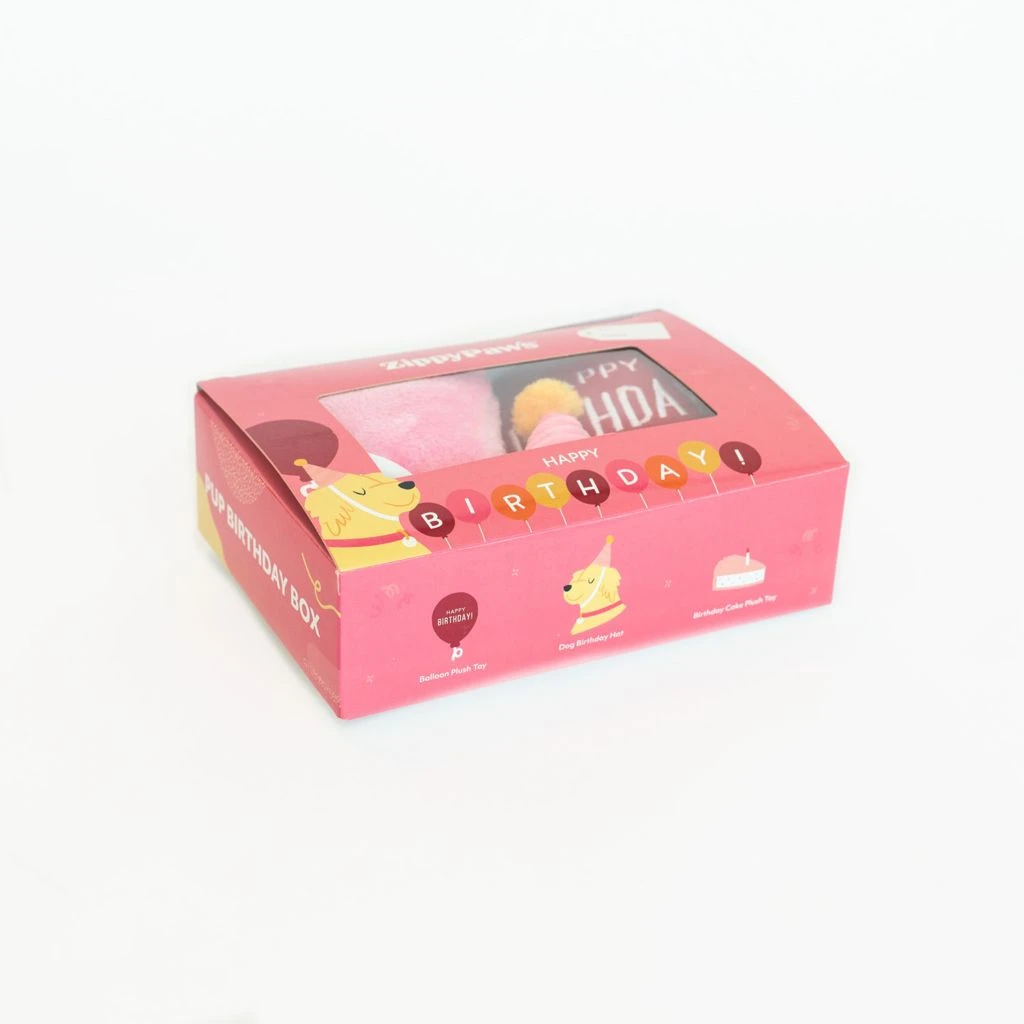 The Pup Birthday Box comes with a small Birthday Cake plush toy, a Birthday Balloon plush toy, and an adorable plush Birthday Hat that they can wear! Hat attaches via an elastic band.