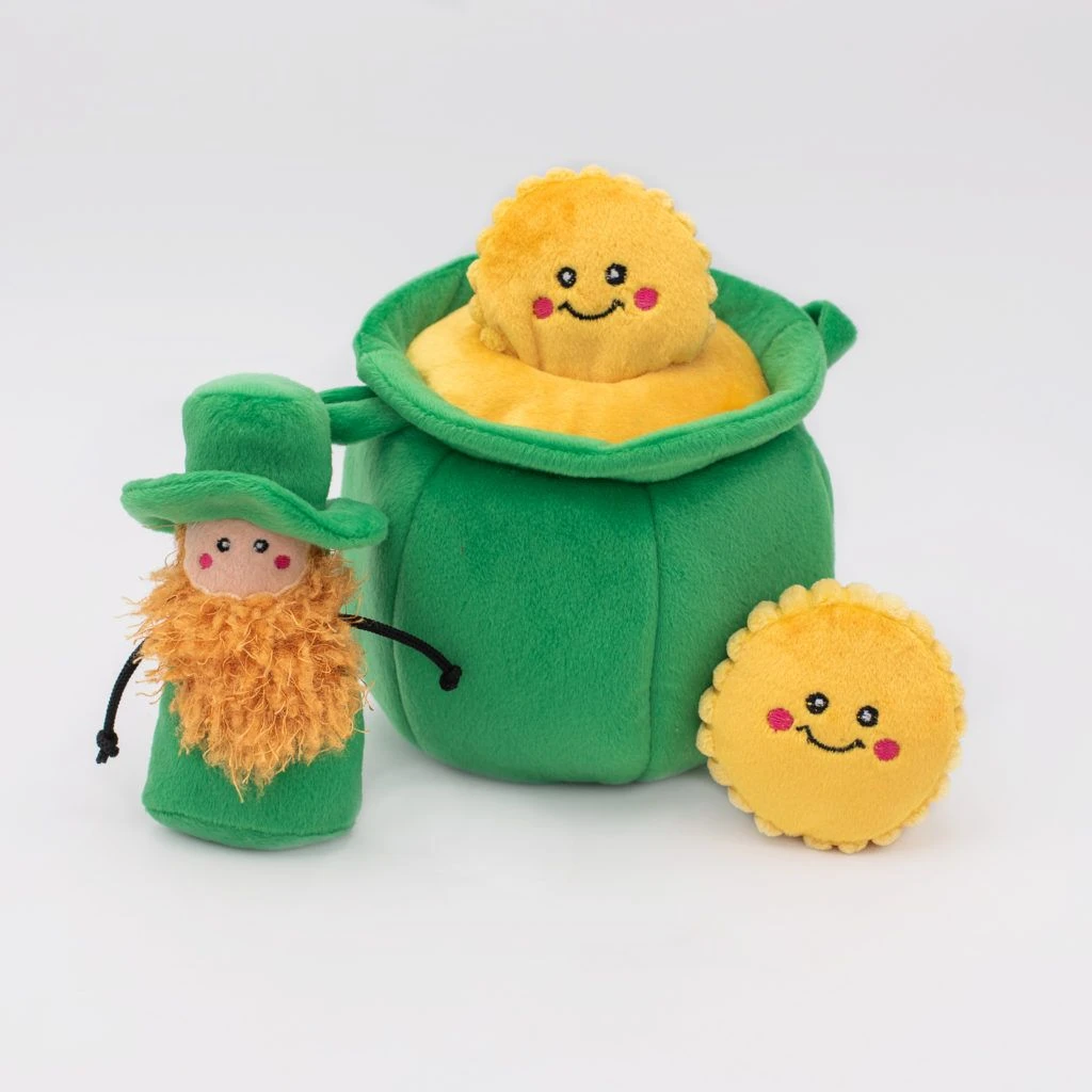 Zippy Burrow® toys are the perfect interactive toy for keeping your dog busy and engaged. Through hide-and-seek play, Zippy Burrow® toys help prevent boredom and promote mental stimulation! This interactive hide-and-seek toy comes with 1 Pot of Gold and 3 squeaky St. Patrick’s Day-themed Miniz!