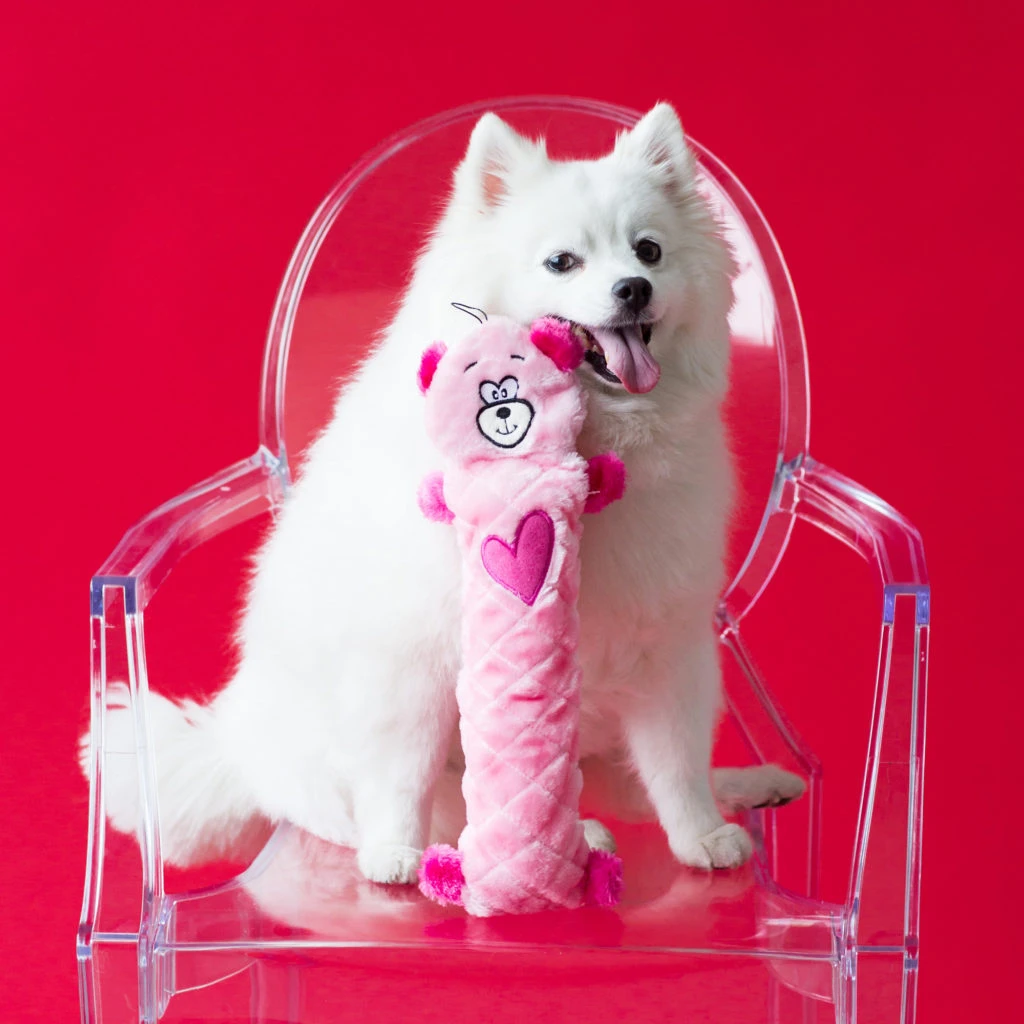 Get your jiggle on with the Jigglerz® Pink Bear plush dog toy from the Valentine’s Jigglerz® collection! Containing a ZippyPaws exclusive Jigglerz® squeaker, this toy produces a unique noise when shaken from side to side.