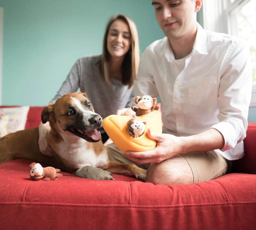 This Zippy Burrow® toy is bananas, B-A-N-A-N-A-S! And your dog will love monkeying around trying to find the pint-sized primates inside! Once your playful pup has them all out, they’ll be begging you to put them back in again and again for hours of fun!